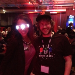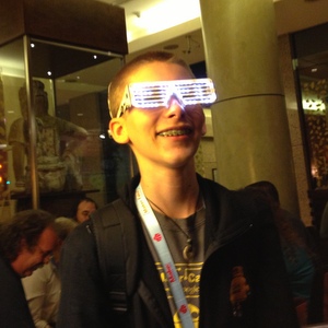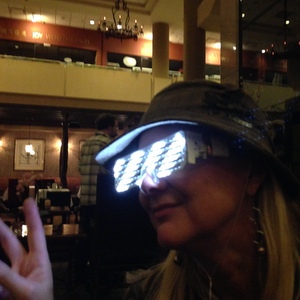 In the meantime, a couple pairs have somehow survived the mechanical problems, and we've been taking them around and having a blast! Scratch that...only one working pair at the moment. Soon, though...there will be hundreds. We can't wait to see all the awesome pictures and videos everyone will post as they wear these, customize the code, and hack them with their own electronic parts. Here's a gallery of a few places the glasses have been, and people who tried them. We think they turn anyone into a rock star! Mike Sexton and Brittany Bell at Jason's poker tournament (WPT + SVEN charity event)