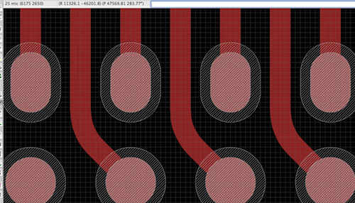 We hoped to finish up development and release them within a month or two of Maker Faire, but quickly discovered some issues with the design. The first was an electronic problem that was solved by switching to alternate transistors row drivers and control chips. The next was a more subtle, yet crippling problem. It's easy to design something that sits on a shelf and operates forever, but anything worn by people is subject to a lot of stress. We found that our QFN driver ICs were actually breaking internally due to board flex! Solving that problem has required a lot of revision and testing. At the moment, we're using much smaller ICs for less impact from board flex, moving them to a stiffer location, and figuring out mechanical methods to reduce stress on the PCB. Some of this is pushing the limits of the board houses we normally use! We have to use 4mil (0.1mm) trace/space rules. This is a WL-CSP part with 0.5mm ball pitch: