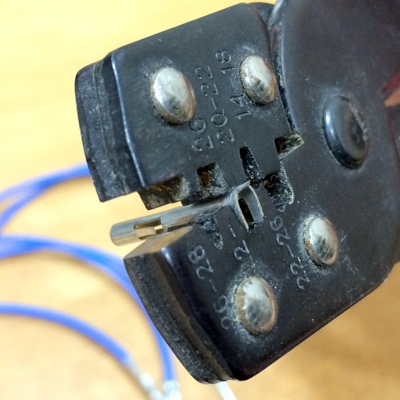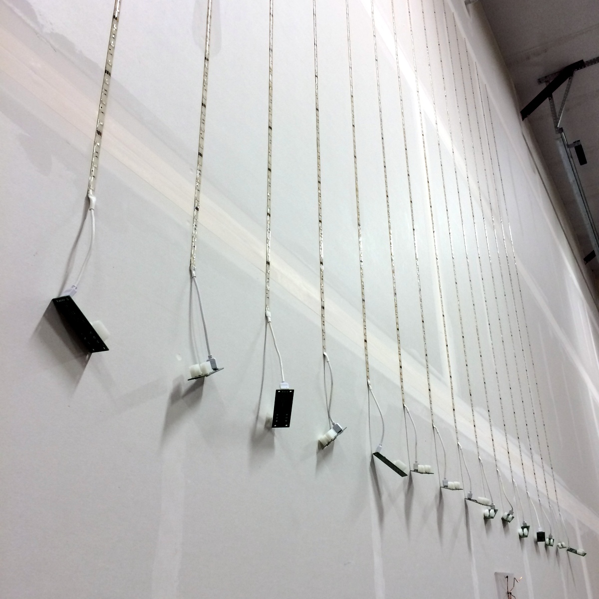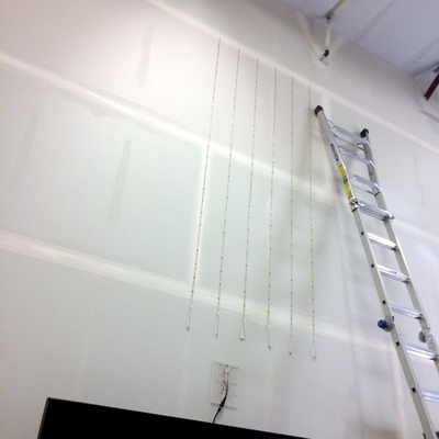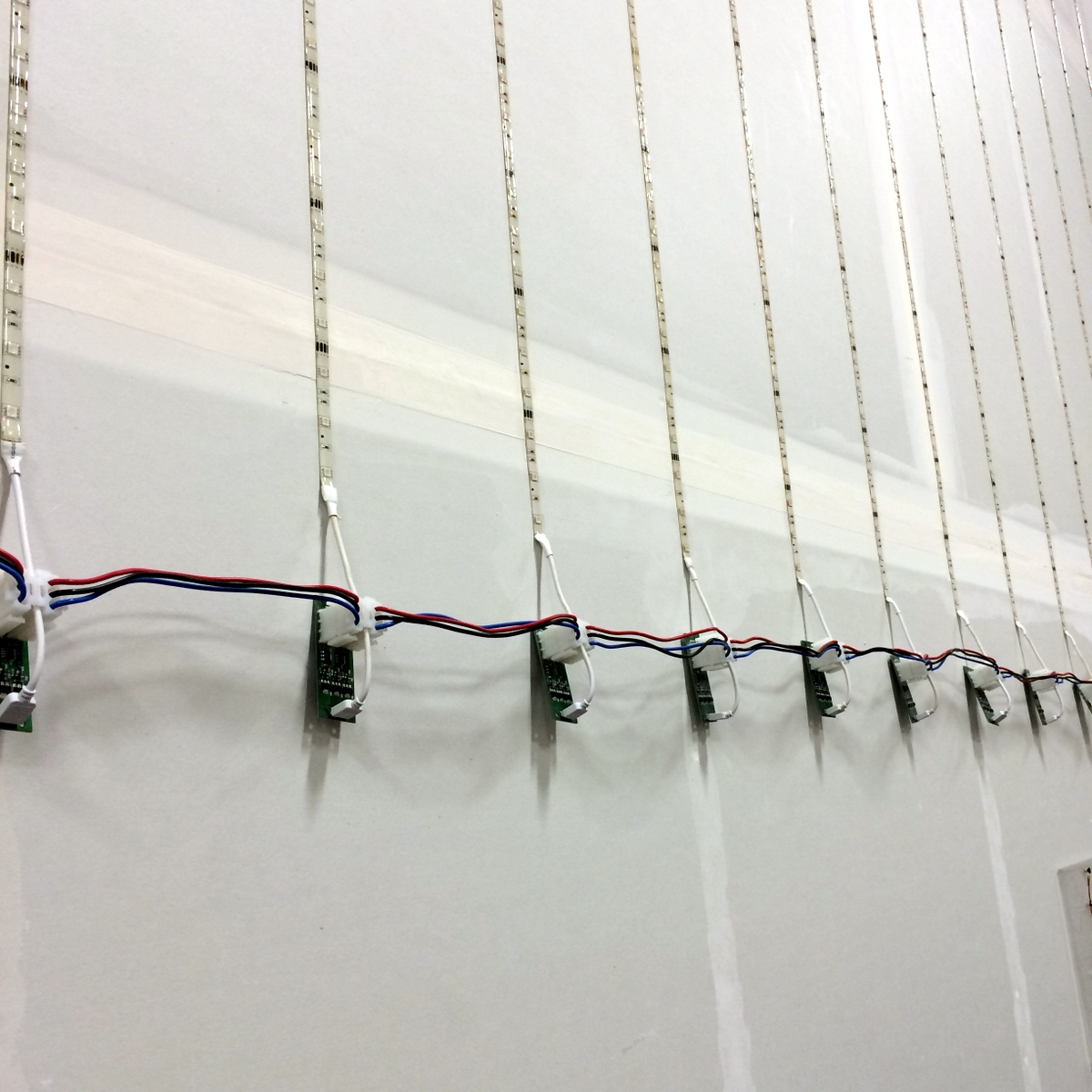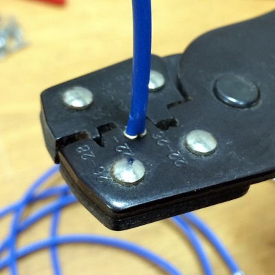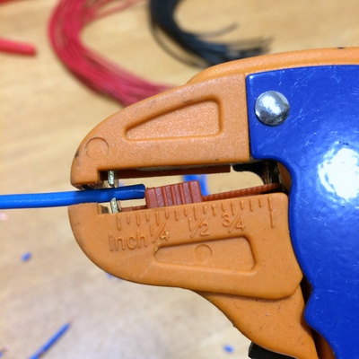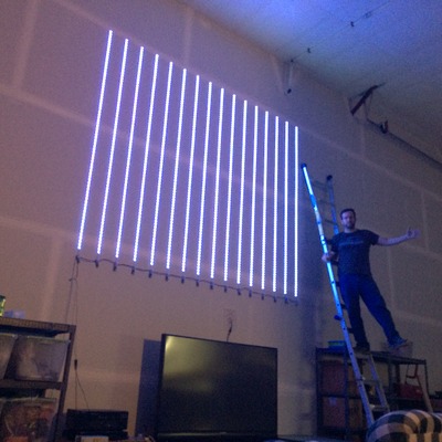 Super-sized Musixel WallAt the World Maker Faire in New York City this year, we were able to show off the RGB Shades in the Maker Shed for the first time ever! It was a lot of fun, and we were positioned right next to our friends at Spikenzie Labs. They brought some new products, including the Musixel (an audio sensor that controls a strip of addressable LEDs). Here's a quick demo video of what the Musixel kit can do: It's a small PCB with an audio input jack, an 8-pin PIC microcontroller, an MSGEQ7 seven-band spectrum analyzer chip, and various passive components. The PIC reads analog values corresponding to several frequency bands from the audio jack, and outputs WS2811-compatible commands. Spikenzie Labs includes a strip of 16 WS2812 LEDs, but it will work with up to 64 WS2812 LEDs arranged in an 8x8 matrix. We've played with the MSGEQ7 chip a few times and had some great results. In addition to a few undocumented wearable projects, here are a couple fun examples: So we ended up with a Musixel Kit after Maker Faire, flew all the way back to Washington, and immediately put the kit together. It's impossible to have too much blinky stuff, and the Musixel kit definitely qualifies. But after playing with it for a bit, we realized that we could take the Musixel to the next level. In our boxes of past semi-products was a neat little module called the StripDriver. It was initially made for a large scale art project. It has some high-current connectors, a WS2811 chip, and some high current transistors. Connect a strip of RGB LEDs and you have a giant LED pixel controllable using the WS2811 protocol. The same protocol that the Musixel uses...so now we knew what we had to do. A giant empty wall in our warehouse was about to get a lot more blinky. We cut some RGB strips to 2.5 meters and mounted them directly to the wall. Probably not the best idea, as we received the warehouse with bare drywall and the strip adhesive really likes to peel off some paper. But that's a problem we'll fix someday. For now, the wall of LEDs is way more fun to think about. After lots of ladder climbing, the strips were finally in place and the StripDriver modules attached. The StripDrivers use large connectors and have wide, doubled-up power traces so that the full array power can pass through the first few modules. This simplifies wiring a bit, removing the need for too many mid-string power taps. For 16 strips, we didn't need to add any extra power taps. We did need to make some custom power and communication cables. After measuring and cutting all the necessary wires, we stripped the ends to prepare for crimping the connectors. This automatic stripper made the job much easier. The connectors AMPT/TE MATE-N-LOK style with separate crimped terminals. As with most crimp terminals, there is a professional tool available...pricing starts around $300 on up. We have a $20 tool that works almost as well! The best way to operate the tool is to clamp the terminal in the tool, insert the wire, and then squeeze all the way down on the handles. With all the cables crimped and ready, all 16 stripdrivers were wired up in a chain that, as far as the Musixel knows, is exactly the same as the little 16-pixel strip that came with the kit. Just way, way bigger! With the StripDrivers wired up to a 12V/30A power supply and the Musixel, it's time to light this sucker up! We've added Garrett for scale. Since the Musixel responds to music, we had to make a quick video showing the final result. Enjoy! Keep an eye out for our next product, a small add-on board for the RGB Shades and LED Matrix Shades. It also uses an MSGEQ7 chip and is way more portable than our warehouse wall!