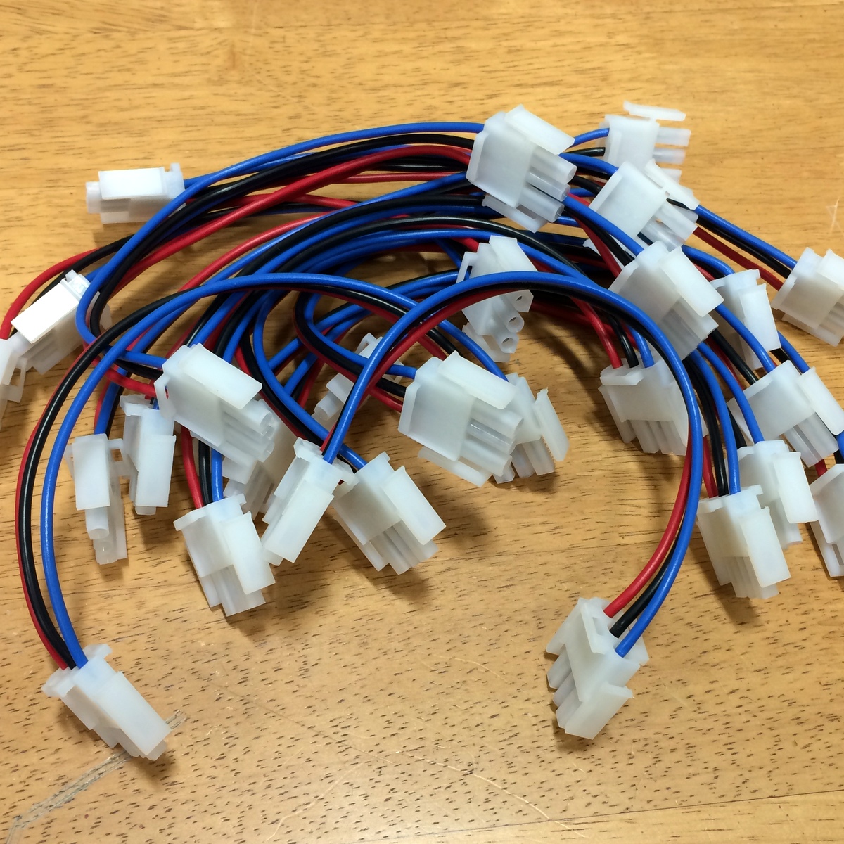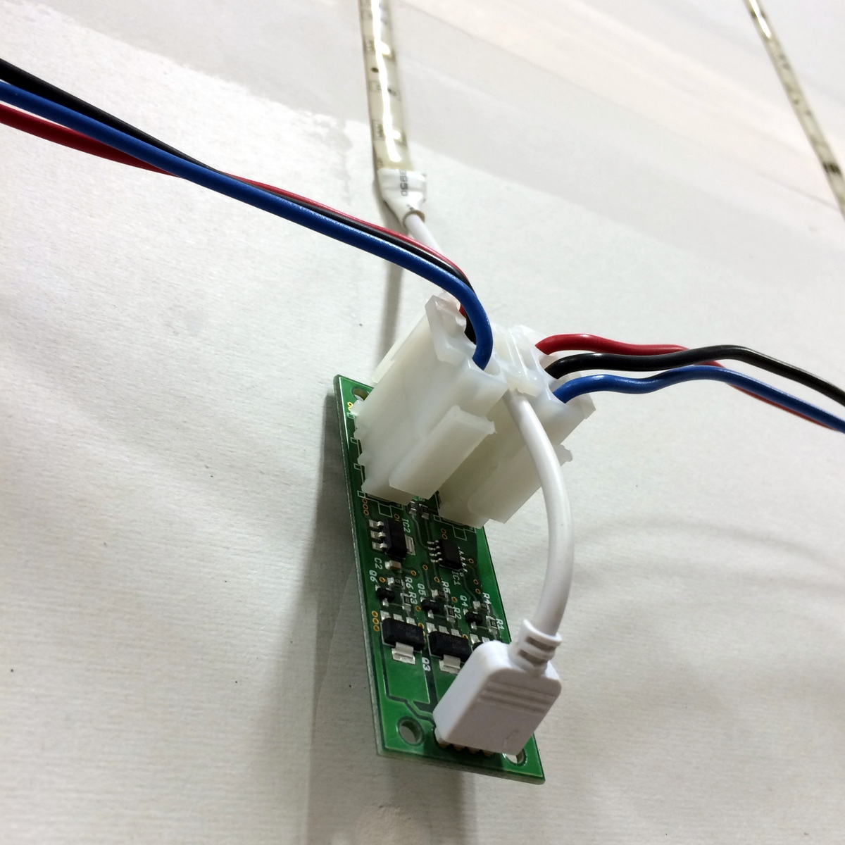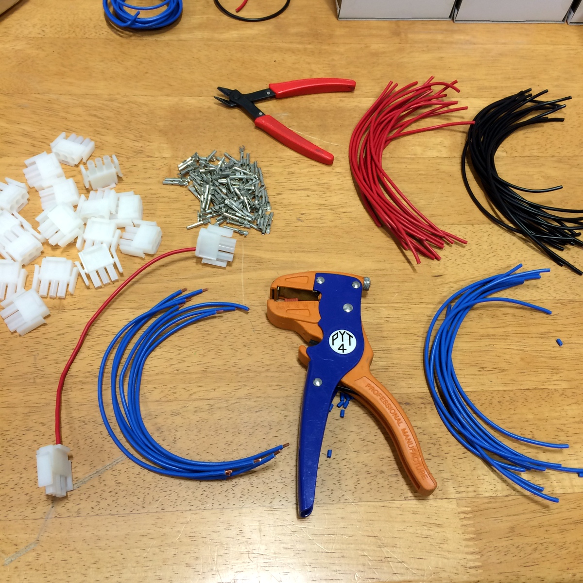 Super-sized Musixel WallAt the World Maker Faire in New York City this year, we were able to show off the RGB Shades in the Maker Shed for the first time ever! It was a lot of fun, and we were positioned right next to our friends at Spikenzie Labs. They brought some new products, including the Musixel (an audio sensor that controls a strip of addressable LEDs). Here's a quick demo video of what the Musixel kit can do: It's a small PCB with an audio input jack, an 8-pin PIC microcontroller, an MSGEQ7 seven-band spectrum analyzer chip, and various passive components. The PIC reads analog values corresponding to several frequency bands from the audio jack, and outputs WS2811-compatible commands. Spikenzie Labs includes a strip of 16 WS2812 LEDs, but it will work with up to 64 WS2812 LEDs arranged in an 8x8 matrix. We've played with the MSGEQ7 chip a few times and had some great results. In addition to a few undocumented wearable projects, here are a couple fun examples: So we ended up with a Musixel Kit after Maker Faire, flew all the way back to Washington, and immediately put the kit together. It's impossible to have too much blinky stuff, and the Musixel kit definitely qualifies. But after playing with it for a bit, we realized that we could take the Musixel to the next level. In our boxes of past semi-products was a neat little module called the StripDriver. It was initially made for a large scale art project. It has some high-current connectors, a WS2811 chip, and some high current transistors. Connect a strip of RGB LEDs and you have a giant LED pixel controllable using the WS2811 protocol. The same protocol that the Musixel uses...so now we knew what we had to do. A giant empty wall in our warehouse was about to get a lot more blinky. We cut some RGB strips to 2.5 meters and mounted them directly to the wall. Probably not the best idea, as we received the warehouse with bare drywall and the strip adhesive really likes to peel off some paper. But that's a problem we'll fix someday. For now, the wall of LEDs is way more fun to think about. After lots of ladder climbing, the strips were finally in place and the StripDriver modules attached. The StripDrivers use large connectors and have wide, doubled-up power traces so that the full array power can pass through the first few modules. This simplifies wiring a bit, removing the need for too many mid-string power taps. For 16 strips, we didn't need to add any extra power taps. We did need to make some custom power and communication cables. After measuring and cutting all the necessary wires, we stripped the ends to prepare for crimping the connectors. This automatic stripper made the job much easier. The connectors AMPT/TE MATE-N-LOK style with separate crimped terminals. As with most crimp terminals, there is a professional tool available...pricing starts around $300 on up. We have a $20 tool that works almost as well! The best way to operate the tool is to clamp the terminal in the tool, insert the wire, and then squeeze all the way down on the handles. With all the cables crimped and ready, all 16 stripdrivers were wired up in a chain that, as far as the Musixel knows, is exactly the same as the little 16-pixel strip that came with the kit. Just way, way bigger! With the StripDrivers wired up to a 12V/30A power supply and the Musixel, it's time to light this sucker up! We've added Garrett for scale. Since the Musixel responds to music, we had to make a quick video showing the final result. Enjoy! Keep an eye out for our next product, a small add-on board for the RGB Shades and LED Matrix Shades. It also uses an MSGEQ7 chip and is way more portable than our warehouse wall!