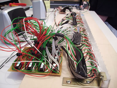 Why ShiftBrites ExistI ran across some photos of an impressive project on Flickr, uploaded in mid-2007. tellini on Flickr was apparently building a bar of individually-controlled RGB LEDs, with an Arduino. Only 1.5 years ago, there weren't many options to get this working; the ShiftBrite was a rough concept buried in a folder in my computer. He used a lot of shift registers, a lot of wire, and a lot of hard work. Here's what the prototype looked like: And after he put the final system together: I was interested in this project because it reminded me of the Giant Election Meter I recently built using 32 ShiftBrites. All I had to do was figure out how to mount the ShiftBrites (I used zip ties) and then chain them together with the premade short cables. The interface to the controller was just four wires, plus power and ground. And the ShiftBrites are capable of 30-bit color (though perceived brightness curves make the top end changes hard to see). I was able to control them with a relatively slow BASIC-programmable controller, though an Arduino also works and other users have created some convenient libraries. Tellini's project looks great, but I imagine it took many hours, possibly a whole week, to build and test. The entire Election Meter project was built in about two hours, including the mounting board, Bluetooth connectivity, and numerical displays. Anyway, I thought it was a good example of the wiring and control problems that ShiftBrites can solve.